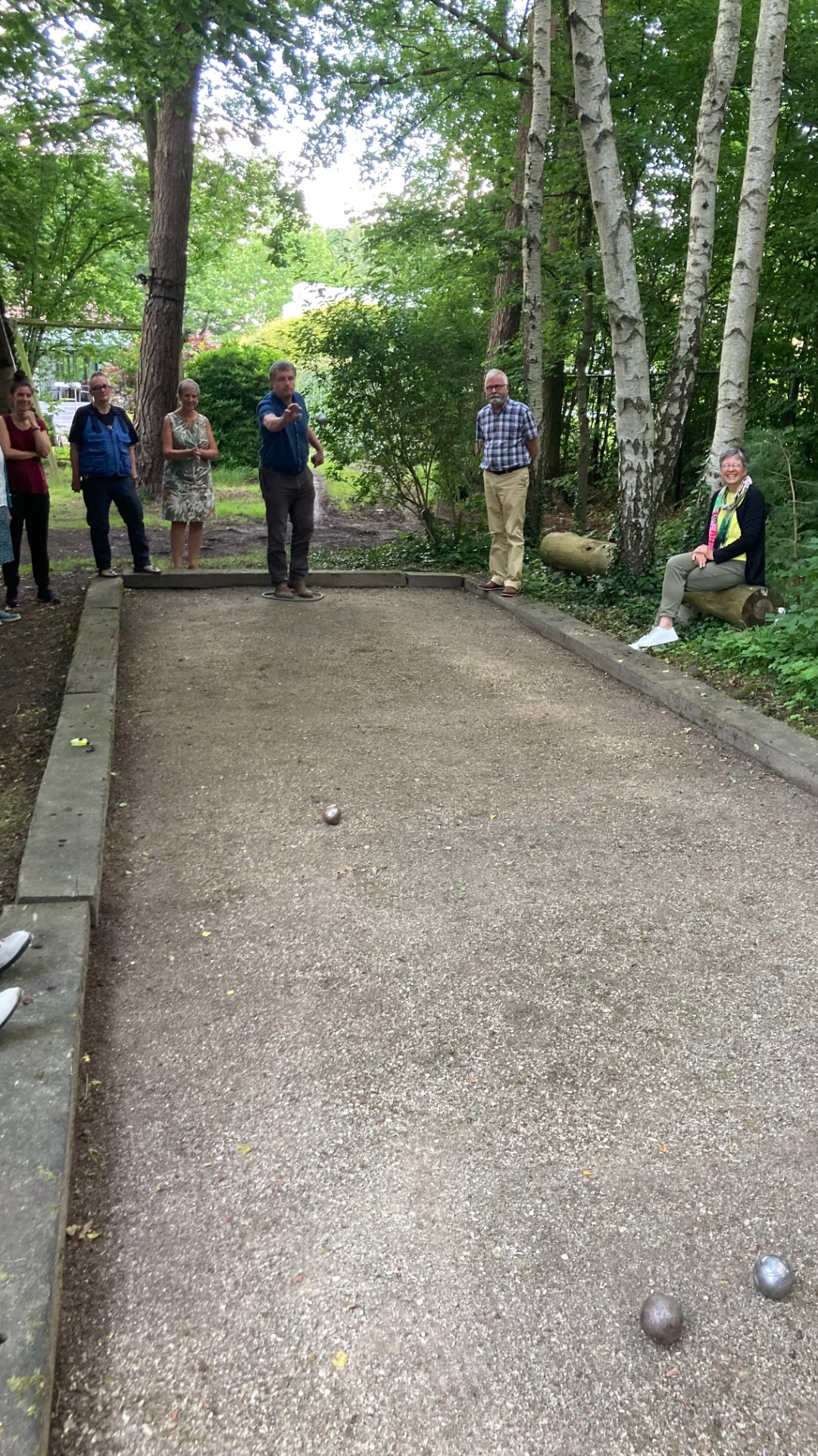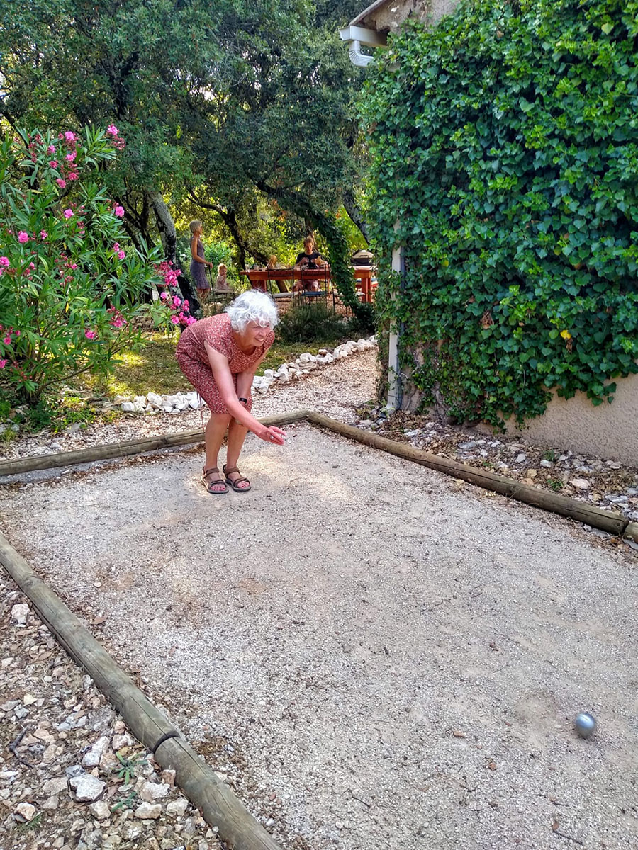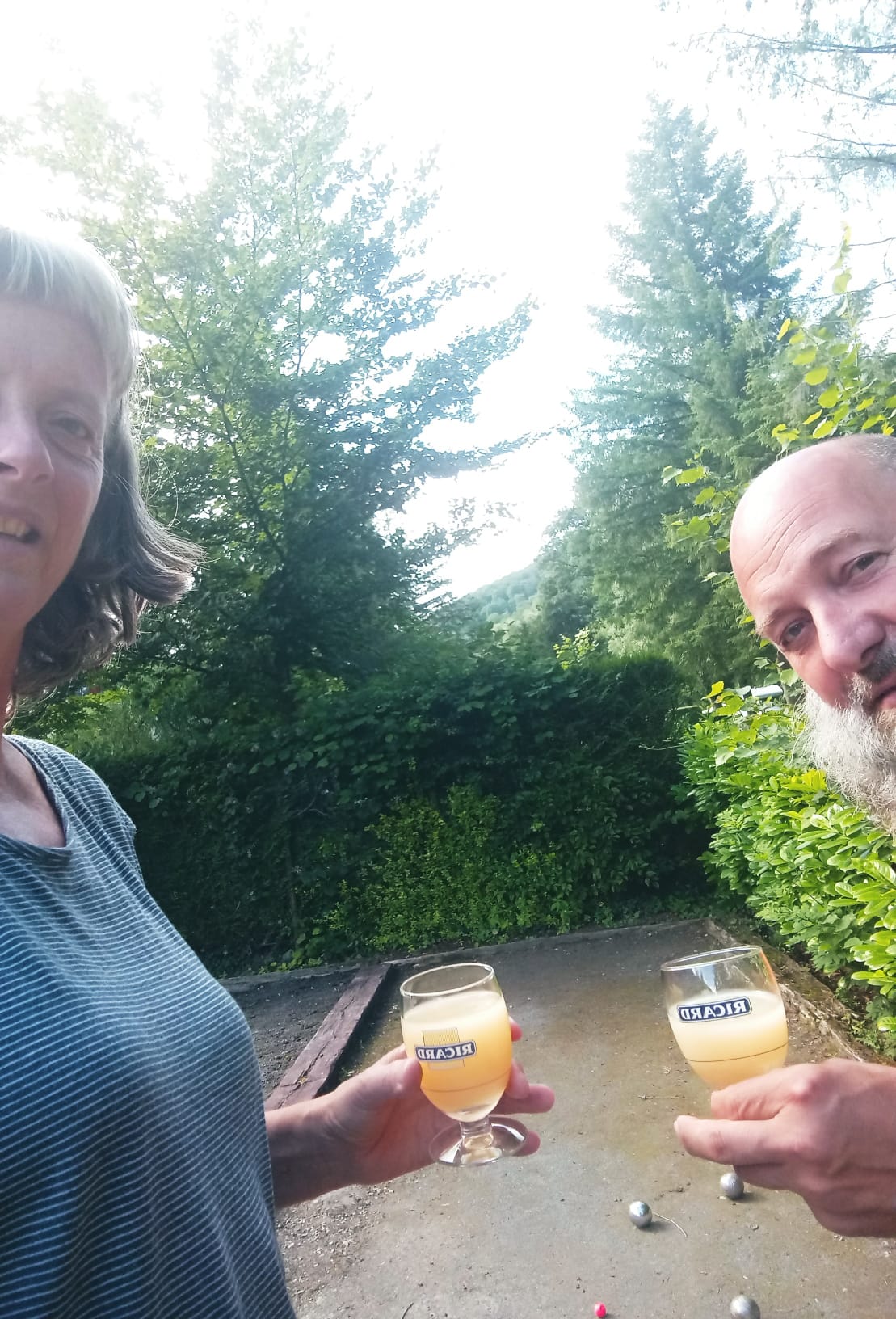 Een berichtje van Lut in de WhatsApp groep Samenleven: een foto van haar en Bart op een petanquebaan in de Ardennen.