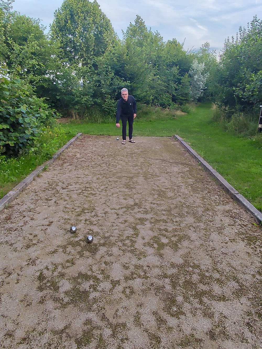 Ik stuur er eentje van de baan hier bij het huis. Stefan en Ann spelen blijkbaar op de camping in Kalmthout en op de ontmoetingsdag bij Bieke en Luc werd blijkbaar ook een ware wedstrijd gehouden. Dat zullen spannende toernooien worden straks in de Wasserij.
